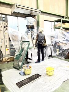 工場内に設置している業務用エアコンを清掃しました。油汚れ、鉄粉、ホコリを除去し清潔に使用できるようになりました。